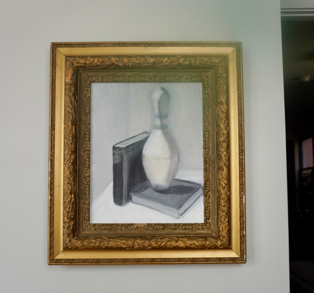 I took Introduction to Painting A (Form & Value) and Introduction to Painting B (Color) with Martin Wall. I taught myself how to oil paint a few years before the pandemic, but I needed these formal courses to close the gaps in my understanding of when and how to use solvents, how to stretch a canvas, and how to critically assess my work. I also learned that I love bringing humor to a still life.