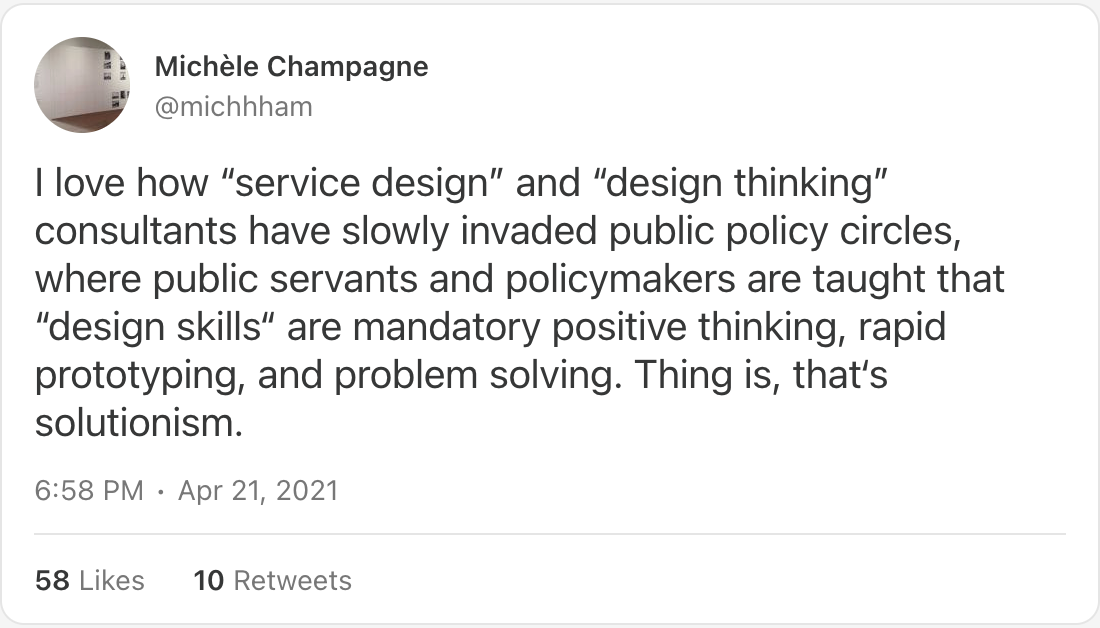 In All About Love, bell hooks said “definitions are vital starting points for the imagination. What we cannot imagine cannot come into being. A good definition marks our starting point and lets us know where we want to end up.” I suppose the inverse of this is that a bad definition can stifle the imagination or lead us to a dead-end. In this spirit, this issue examines what civic tech loses when it leads with the concepts of “customer service” and “administrative burden” and not larger political goals. This issue invites the reader to put limiting concepts in their place, imagine wildly, and hold out for something better.